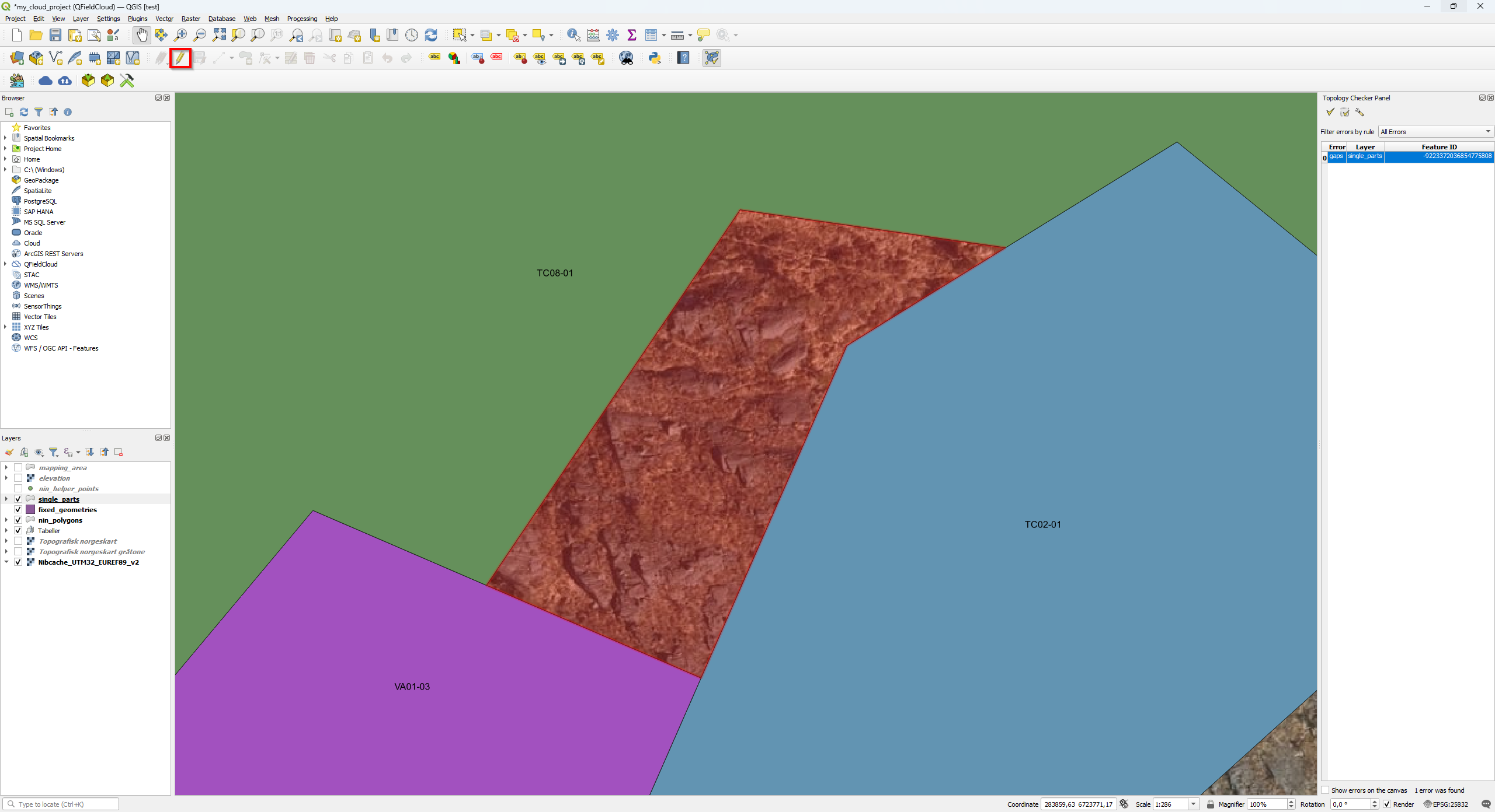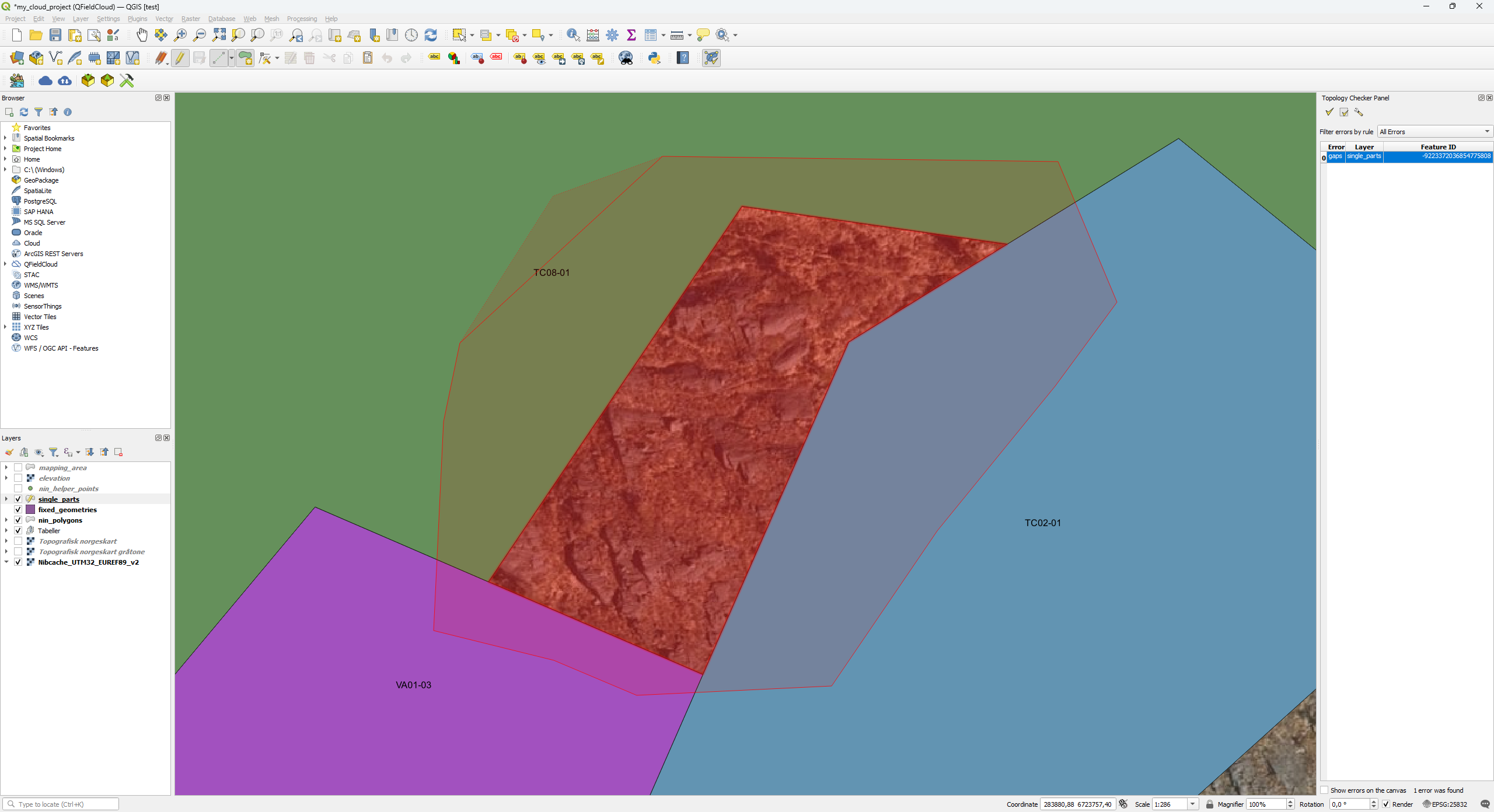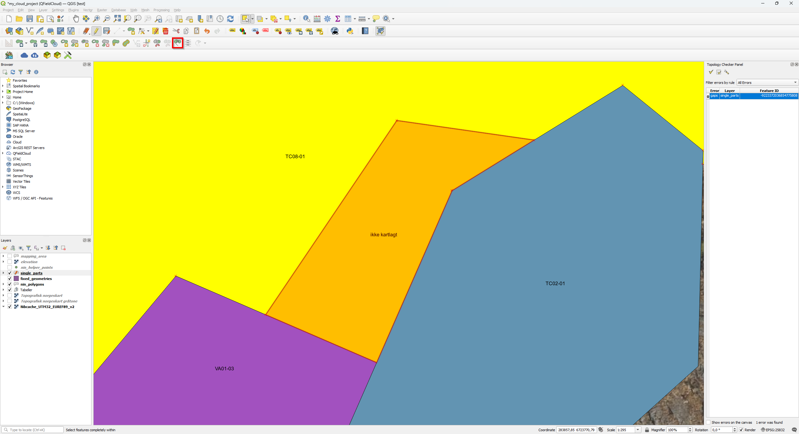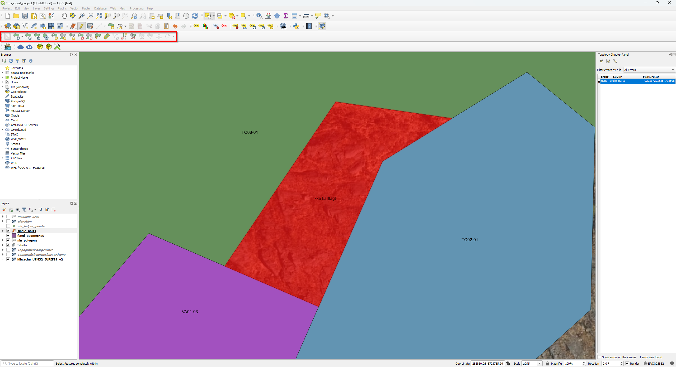 Under kartlegging kan det oppstå topologifeil når polygonene utfigureres. Dette kan føre til følgefeil om man vil bruke kartet i analyser i etterkant av feltarbeidet. I bildet nedenfor er det vist et utvalg av topologifeil: