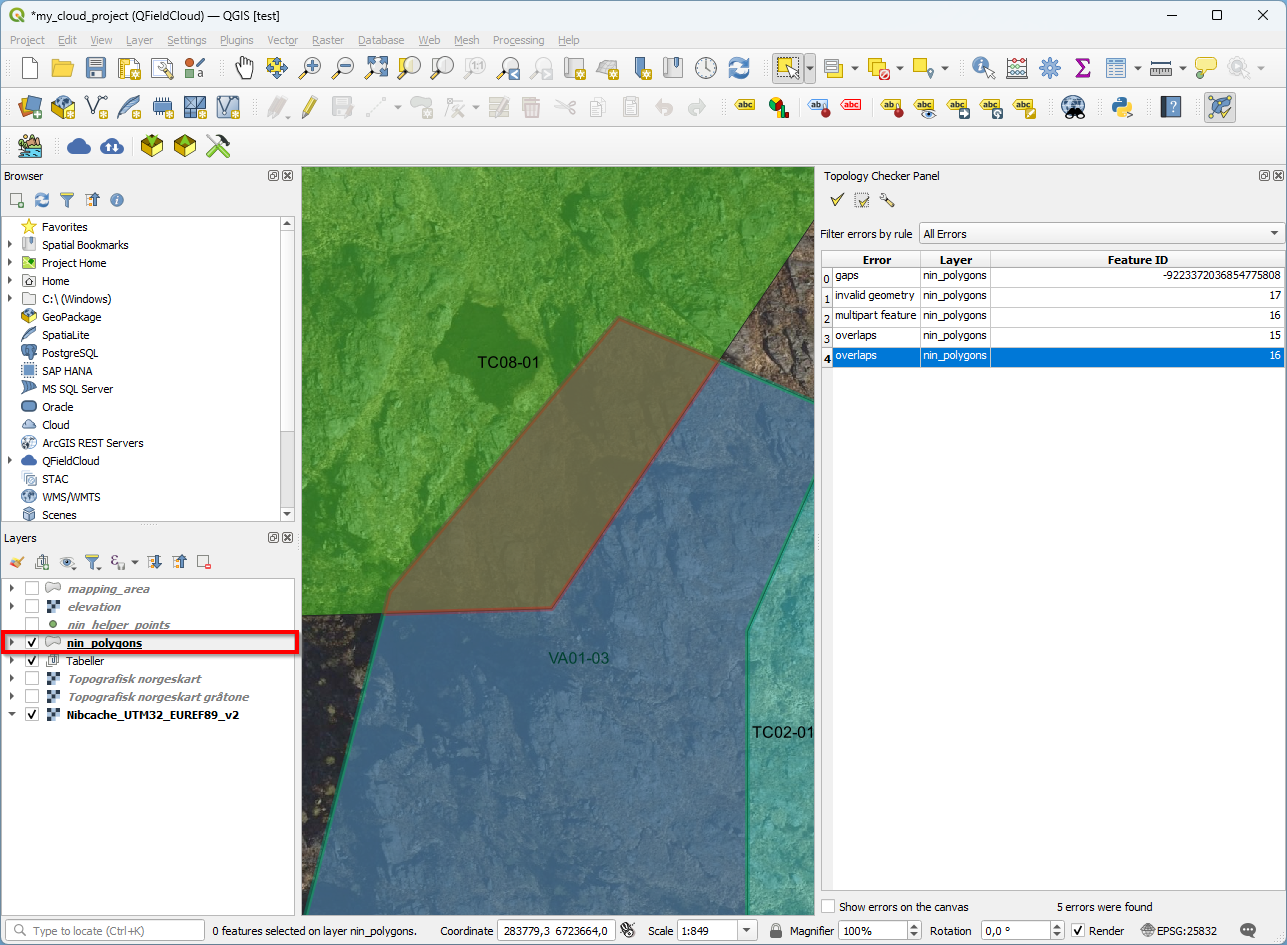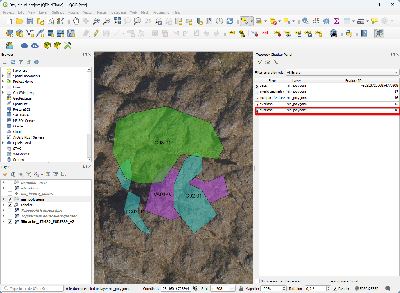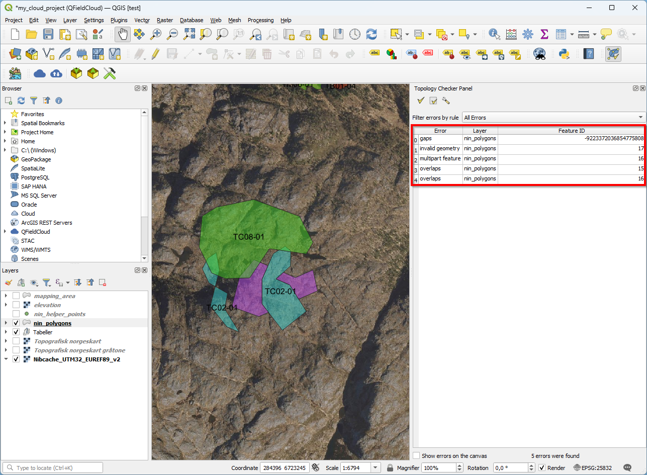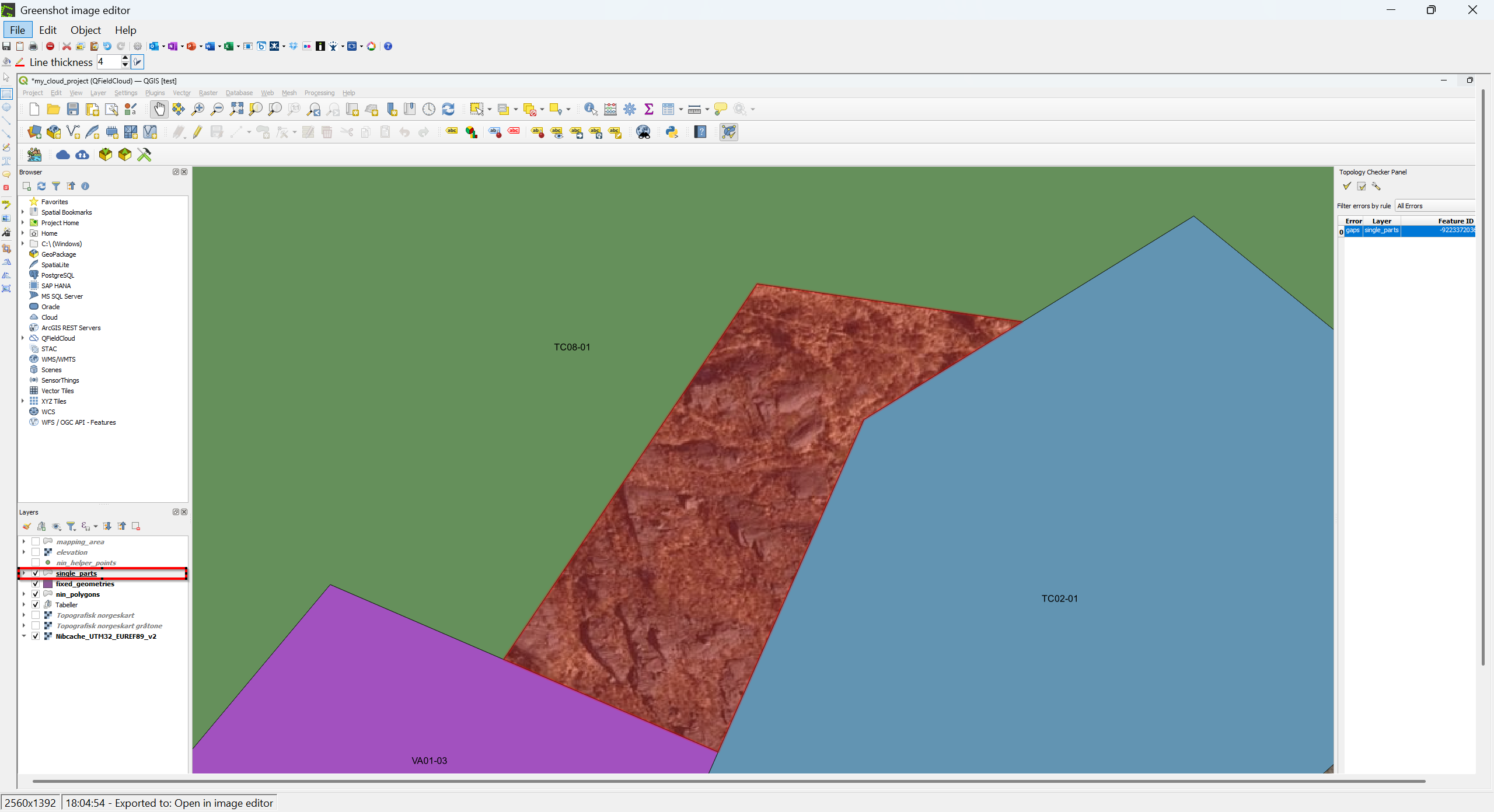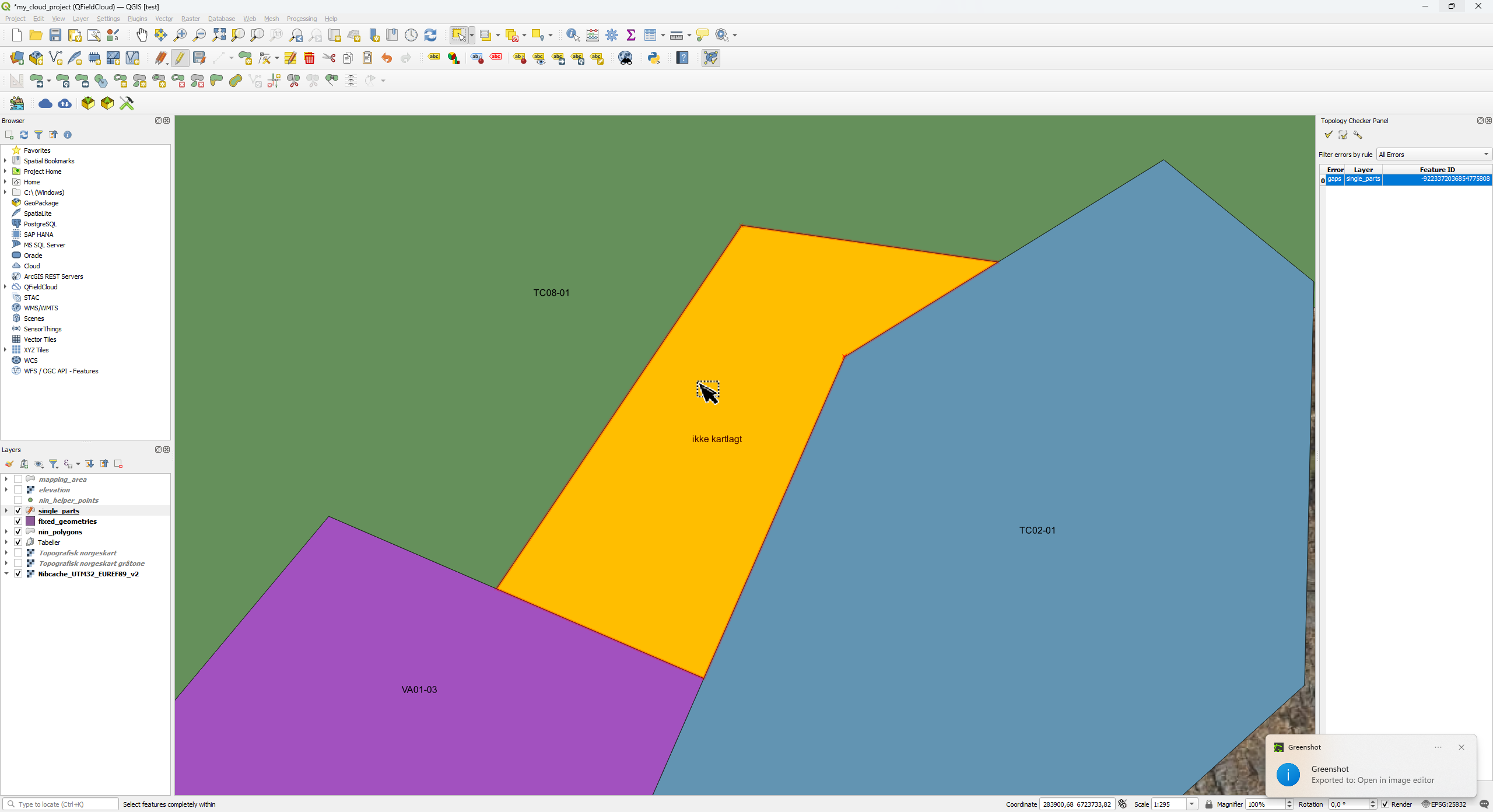 Under kartlegging kan det oppstå topologifeil når polygonene utfigureres. Dette kan føre til følgefeil om man vil bruke kartet i analyser i etterkant av feltarbeidet. I bildet nedenfor er det vist et utvalg av topologifeil: